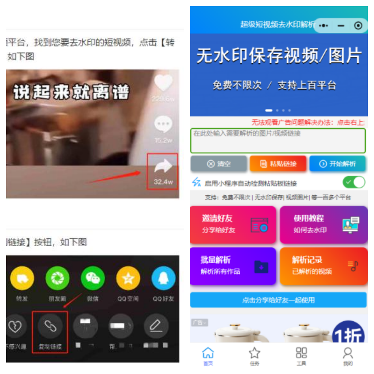 有些平台上的内容可能无法直接下载,你可以使用小程序去水印并下载视频或图片素材。