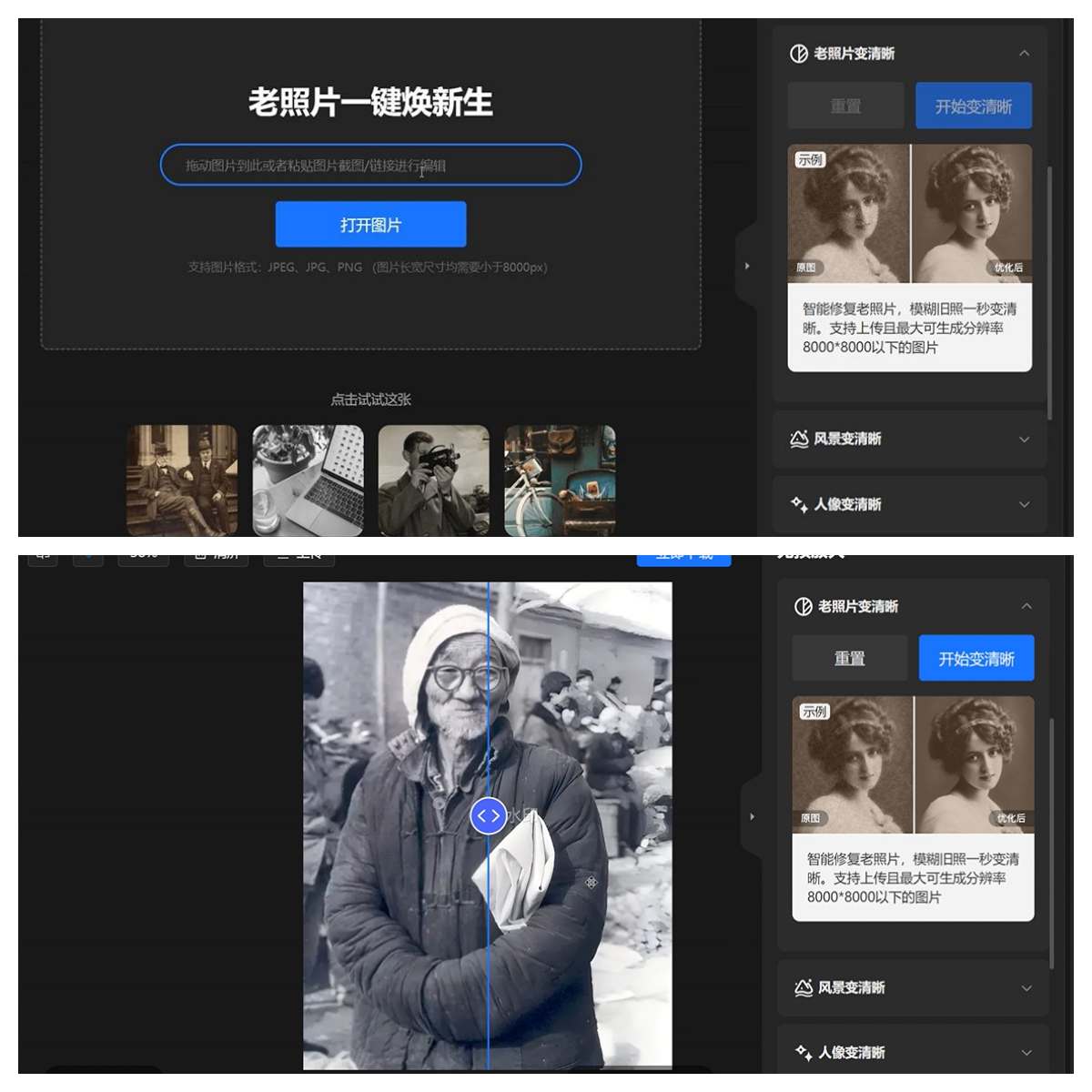 要让老照片变得高清,可以点击热门推荐中的“老照片变清晰”,然后上传图片生成高清效果,下载保存即可。