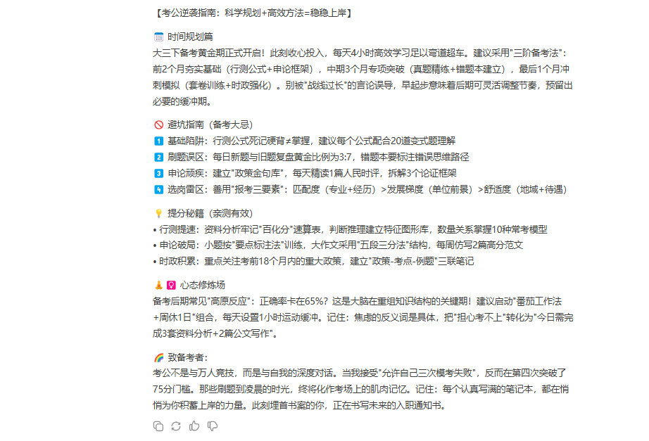 我们可以给DeepSeek输入类似以下提示词:“我给你3段考公的文案,你帮我分析这些文案的内容和结构,并重新写一篇,综合它们的精华内容。”