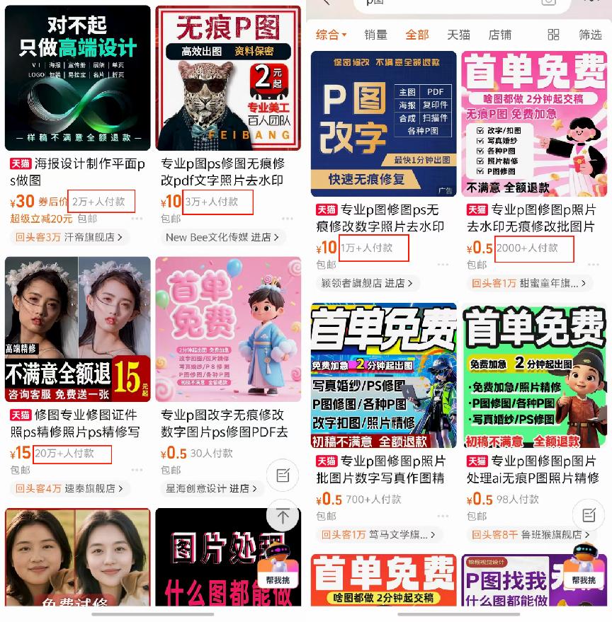 我们打开淘宝,搜一下P图,就可以看到非常多的商家,可以看到销量都是上万的。