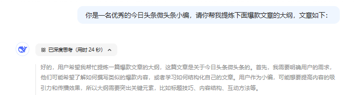 将下面这段话复制给DeepSeek:“你是一名优秀的今日头条小编,请你帮助我提炼以下爆款文章的大纲,文章内容如下:”