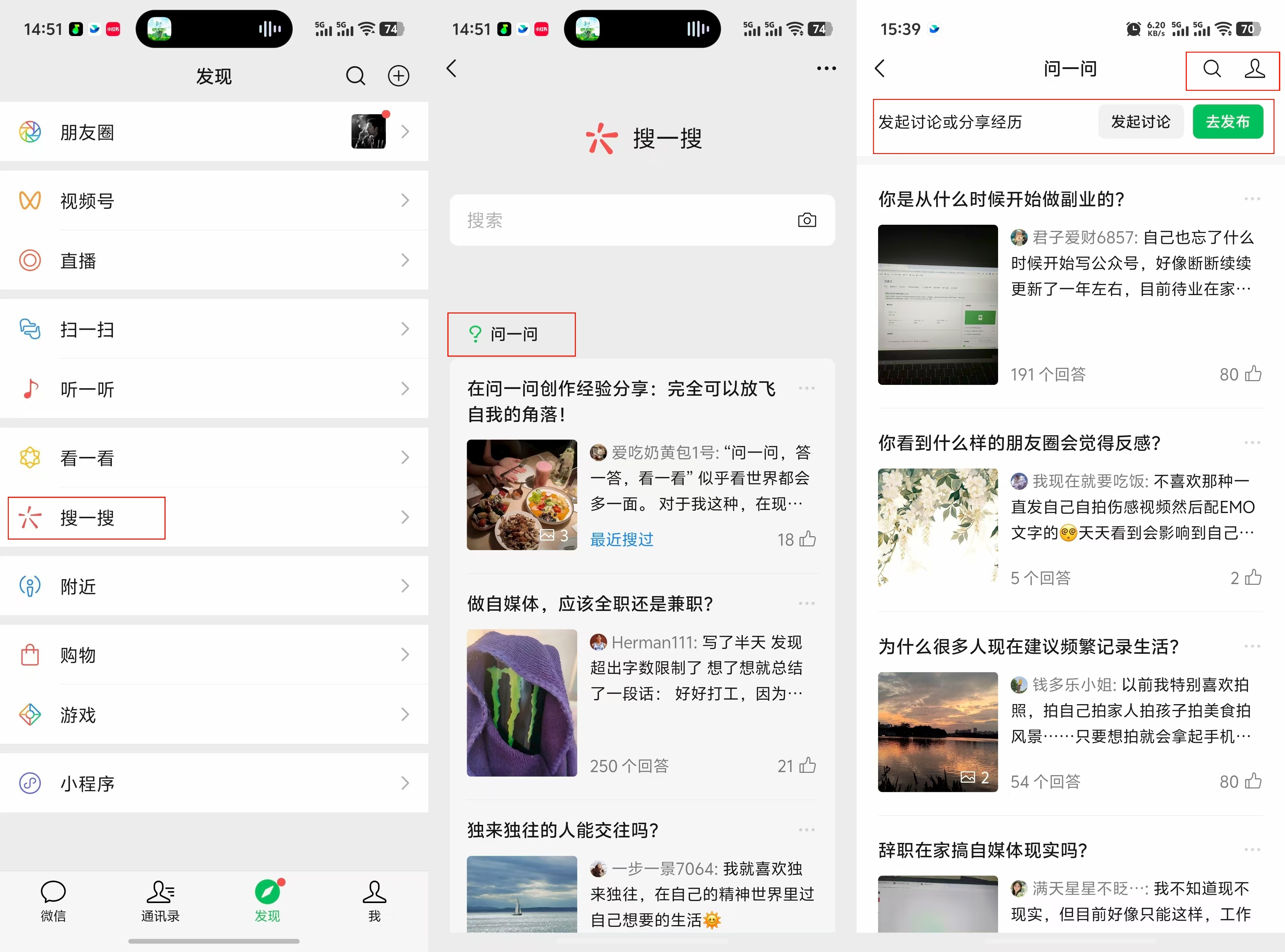 问一问入口:微信“发现”页面→进入“搜一搜”→点击前往“问一问”。