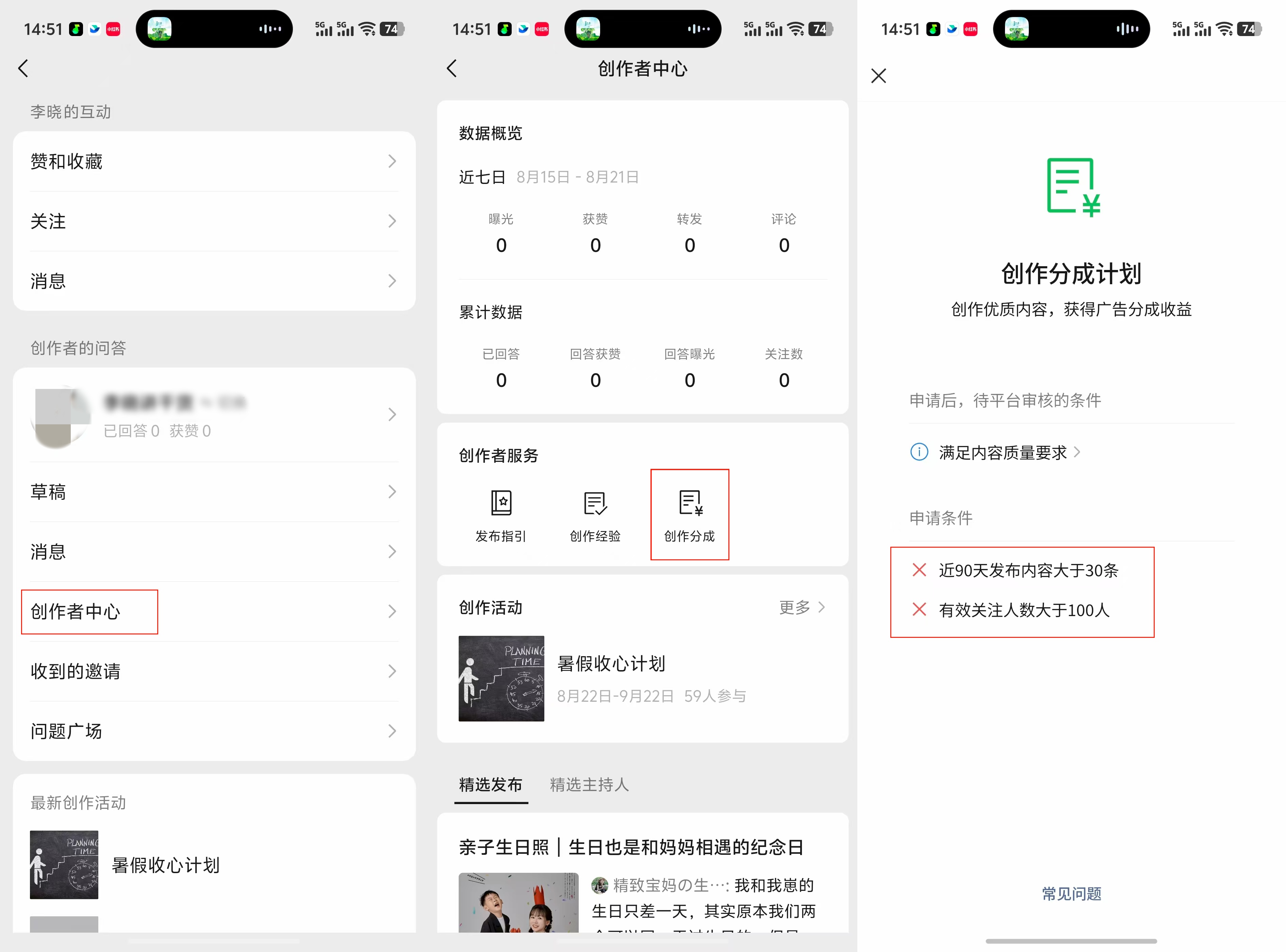 进入问一问,个人创作中心,点击创作分成,可以看到加入要求